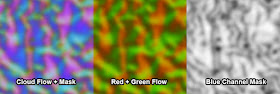 This is the flow map generated from the main cloud layer. The red and green channels are similar to a blurry normal map (openGL style) generated from a the main clouds layer height. The smaller clouds will flow outward from the thicker parts of the main clouds. The blue channel is a mask for where there may be pinches due to the flow pushing a lot of the clouds texture into a small area. This doesn't look great on clouds so we want to mask out places where this will occur.